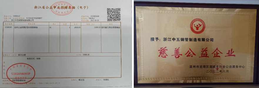 2022年6月公司獲得了溫州市龍灣區(qū)溫暖里社會公益服務中心頒發(fā)的“慈善公益企業(yè)”稱號。并在2022年8月又向平陽縣慈善總會捐贈了10000元善款。